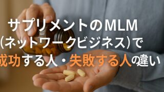 MLM サプリメントのMLM(ネットワークビジネス)で成功する人・失敗する人の違い サプリメントのネットワークビジネス(MLM)の仕組み・メリット・デメリット・注意点をわかりやすく解説。信頼できる企業の見極め方や成功のコツも紹介します。 2025.10.06 MLM